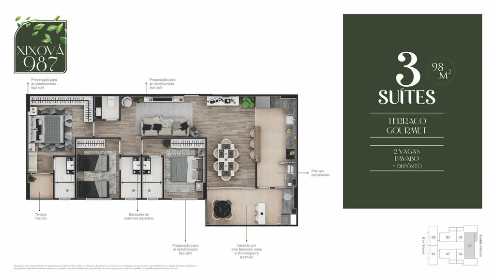 Apto de 3 Dorm c/ 3 SUÍTES, 2 vagas, SACADA GOURMET, 98,38 m² de área útil. BAIRRO: CANTO DO FORTE.