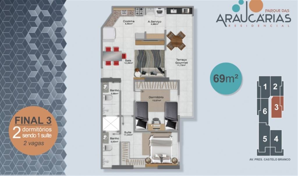 Apto de 2 Dorm c/ SUÍTE, VISTA MAR, 2 VAGAS, 69,78 de área útil. BAIRRO: JARDIM REAL.